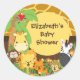 Commencez votre baby shower à thème jungle avec nos adorables autocollants de baby shower safari pour bébés animaux. Notre autocollant de jungle mignon dispose d'un arrière - plan imprimé de girafe avec un palmier, perroquet, girafe, lion singe, tigre & zèbre posé sur une feuille de jungle avec des fleurs arrière - plan. Visitez notre boutique pour voir ce design en différentes variantes et pour apparier cartes de remerciements, timbres-poste et invitations. ©Papier Pixal