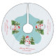 Jupe de Noël personnalisable avec dessin de Destei représentant un bonhomme de neige mignon portant un foulard rayé rouge et blanc et un casquette rouge. Derrière le bonhomme de neige, il y a des sapins verts. La couleur arrière - plan moyenne est turquoise avec un motif de points tandis que la zone extérieure est blanche. Sous l'image du bonhomme de neige on lit "Joyeux Noël" en rouge avec une zone de texte personnalisable pour un nom de famille.