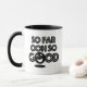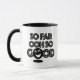 Jusqu'À Présent, C'Était Très Bon Joyeux Mug. L'art affiche une police en ligne noire audacieuse avec un visage heureux conçu comme faisant partie du mot "bon". Montrez que vous êtes un progrès positif pour les autres en sirotant votre boisson chaude préférée de cette tasse montrant la joyeuse So Far Ooh So Good print sur les deux côtés. Fait un excellent cadeau pour la famille ou les amis. Merci pour le support et la visite de mon magasin - UniquelyDistinct. N'hésitez pas à transférer cette conception sur d'autres produits Zazzle.