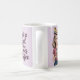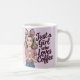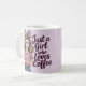 This mug displays a digital illustration of a young woman with wavy shoulder-length hair and a large multicolored striped bow in her hair. She is wearing a rose-colored t-shirt and blue jeans, holding a white disposable coffee cup with both hands. Her expression is cheerful with a bright smile. The background is a solid lavender color. On the right side of the image, there is stylized text in purple that reads Just a Girl who Loves Coffee in script. The mug is a classic mug. The coffee mug is an eleven ounce mug. The mug is microwave and dishwasher safe.