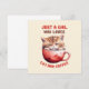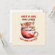 Célébrez votre amour pour les chats et le café avec notre adorable carte de voeux "Just a Girl Who Loves Cats and Coffee"! Doté d'un chaton mignon qui sort d'une tasse de café rouge, ce charmant tableau est parfait pour les amoureux de les chats comme pour les amateurs de café. Un cadeau délicieux pour vous-même ou pour cette personne spéciale qui adore les chats câlés et les moments de café confortables.
