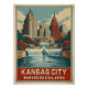 A retro-style depiction of Kansas City's skyline with a flowing waterfall in the foreground. The artwork combines urban architecture with natural elements, creating a nostalgic feel.