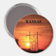 Une photo d'un coucher de soleil de Kansas avec silhouettes de ligne électrique closeup qui est lumineux et coloré. Au nord de Hutchinson Kansas. C'est sur un aimant rond.