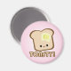Un mignon aimant avec un morceau souriant de pain grillé avec du beurre fondu au-dessus du mot Toasty! Dans la police Bauhaus 93. Un petit-déjeuner gourmand pour les amateurs d'humour kawaii !