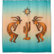 Décorez votre salle de bain avec ce rideau de douche Kokopelli en cuivre "One of a Kind" unique au sud-ouest de Kokopelli! Il comprend deux Kokopelli en cuivre jouant la Flûte et dansant autour d'un cactus sous le soleil sur un Arrière - plan de soleil turquoise et orange! C'est un Art Design original de l'artiste Kerry Miller.