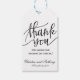 Les étiquettes de faveur de mariage présentent le nom de la mariée et du marié et le monogramme du mariage dans un script élégant.
