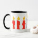 Une tasse à café blanche pour Kwanzaa avec jante et poignée noire et sept bougies dans les couleurs traditionnelles Kwanzaa de rouge, vert et noir, d'un collage de papier peint à la main par Judy Adamson.