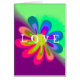 Une fleur de paix rétro colorée est l'arrière - plan du texte "L O V E" sur cette carte de voeux. L'intérieur est vierge, vous pouvez utiliser la carte pour n'importe quelle occasion.