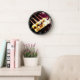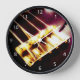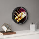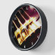 La photographie abstraite originale de ZoeSPEAK sur cette horloge murale avec un thème musical se concentre sur la base d'une guitare basse électrique, la partie où les cordes commencent et s'élèvent jusqu'au manche. La coloration de la photo en gros plan est faite de bruns chauds riches et profonds avec une lumière dorée sur la plaque métallique, les cordes, les vis et les ressorts.