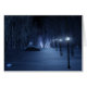 Un sentier enneigé serpentant à travers la forêt de bouleaux, lors d'une nuit d'hiver sombre. Le chemin est bordé de lampadaires qui dégagent une lueur bleu argenté, mais dans les ombres sont lumineuses, des formes fascinantes comme de petites lumières féeriques, attirant le voyageur hors du sentier. Au loin, la lueur de lavande d'un mystérieux rassemblement de forêt illumine le ciel froid.