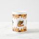 jolie porcelaine, bonne dimension effet brillant bien dans l'ensemble. Le motif et les couleurs sont réussis.Je trouve néanmoins dommage de ne pas occuper tout l'espace avc le motif car la partie rouge au dos de la tasse est trop présente et pas intéressante visuellement.