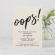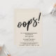 La distinction de cette suite est due à la police de script manuscrite moderne utilisée pour les phrases d'accent. Si vous êtes en position de devoir informer vos invités mariages que vous avez dû changer votre grand rendez-vous, voici une option humoristique. Dans cet article, la police de caractères manuscrite a été utilisée pour créer un graphique simple représentant le mot "oops!". Utilisez les champs modèles pour ajouter vos détails personnels et faire de ce design unique et moderne votre propre. L'arrière - plan peut être changé en n'importe quelle couleur. Une option horizontale est également disponible. Veuillez communiquer avec toute demande spéciale ou customiser de l'aide. // 100 //