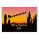 Une carte de Noël pour votre femme montrant Père Noël survolant le désert. Beaucoup de gros cactus sont vus en silhouette. Souhaitez un joyeux Noël du désert avec une belle carte couleur coucher de soleil.