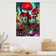 Une grande forêt de champignons où l'on trouve de grands champignons rouges et violets, du ciel bleu et des arbres dans l'arrière - plan. C'est un art généré par l'IA