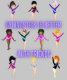 La gymnastique est meilleure avec les amis en police violet néon, dispose de 10 gymnaste adorable tous avec une variété de cheveux, oeil, peau et couleur leotard.