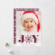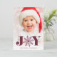 Le carte photo de vacances Whimsical présente une photo verticale ou portrait préférée avec "JOY" comme un riche texte de prune bordeaux superposé en bas. Une illustration de flocon de neige remplace le "O". Personnalisez avec votre salutation personnalisée et les noms le long du bas.