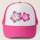 Maintenez le soleil hors de vos yeux avec ces casquette élégants, pour la plage, d'été de camionneur dans les roses indien et blanc. Comporte une conception florale girly et tropicale de fleur rose et mauve de ketmie. Fait un grand cadeau ! Entièrement personnalisable. Une conception originale par @Girl_o_licious.