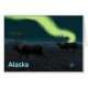 Deux caribous de taureau en berne se promènent la nuit dans la toundra pendant qu'ils migrent vers le sud pour l'hiver. Le givre est sur le sol et les aurores boréales brillent au-dessus de montagnes lointaines. Le texte "Alaska" apparaît en bleu et blanc brillant.