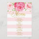 Le menu de dîner de mariage dans le rose en pastel léger rougissent et le motif blanc de rayures avec les fleurs vintages d'aquarelle rose et le texte d'or, personnalisables avec vos détails et disponibles dans les produits assortis de mariage.
