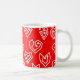 Cette tasse a un design moderne du milieu du siècle Valentin de mazes de coeur blanc éparpillés sur un champ de rouge.