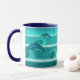 Surfer avec des dauphins. L'original de cette pièce a été peint en acrylique sur toile avec collé sur des coquilles, du sable et des pierres pour plus de détails. Pour cette tasse, la pièce originale a été photographiée et enveloppée autour de la tasse.