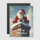 L'image montre le Père Noël assis au sommet d'une cheminée en brique recouverte de neige, vêtu de son costume rouge emblématique avec une garniture de fourrure blanche et un chapeau rouge. Il sourit chaleureusement, ses mains gantées serrées l'une contre l'autre, tandis que la neige tombe doucement autour de lui. L'arrière-plan présente un ciel hivernal doux avec des nuages légers, renforçant l'atmosphère festive et magique de la scène.