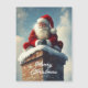 L'image montre le Père Noël assis au sommet d'une cheminée en brique enneigée, vêtu de son costume rouge emblématique avec une garniture de fourrure blanche et un chapeau rouge. Il sourit chaleureusement, ses mains gantées serrées l'une contre l'autre, tandis que la neige tombe doucement autour de lui. L'arrière-plan présente un ciel hivernal doux avec des nuages légers, renforçant l'atmosphère festive et magique de la scène.