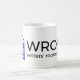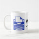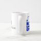 Tasse blanche comportant le nouveau logo bleu de la salle des auteurs de Boston.