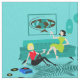 Elle ressemble à elle va être un temps d'amusement avec le ce nuit de rétros filles kitschy' dans le tissu. Le style des années 1960, les caractéristiques de conception minimalistes d'art deux femmes avec les cocktails roses complètement à une moitié du siècle salon moderne, d'aqua et de turquoise. Ces dames savent certainement détendre. La beauté d'une chevelure de corbeau dans le flirty, robe de vert lounging sur le sofa atomique. Son compagnon blond s'assied sur une couverture d'impression de zèbre, utilisant une agrostide blanche et un pantalon serré et noir. Les appareils d'éclairage et de lampion de cru, de joueur de disque vinyle ont placé l'humeur. Encadré, âge d'espace, copie d'art de globe accroche au-dessus du sofa de mod.