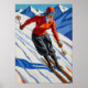 Une peinture à l'huile Art Déco dynamique représentant un chic flapper en descendant gracieusement sur une pente, sa forme géométrique stylisée dans une veste rouge vibrante définie par un éclairage spectaculaire de chiaroscuro contre un paysage de montagne majestueux.