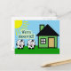 Des cartes de déménagement amusantes et mignonnes avec deux vaches debout à l'extérieur de leur nouvelle maison par un beau jour ensoleillé.