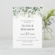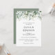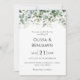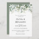 Faire-part de mariage design, avec bordure verte d'eucalyptus, sur un arrière - plan blanc, facilement personnalisée.