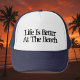 La vie est meilleure à la plage chapeau camionneur beige brun pour la pêche et plus encore. Citation de bonheur mignon / dicton d'inspiration drôle avec typographie vintage. Design d'apparence défraîchi cool. idée cadeau cool pour une nouvelle maison, fête de retraite, maison de plage, navigation de plaisance / voile etc. Faites votre propre casquette personnalisé pour les hommes et les femmes retraités, papa, maman, père à la retraite, oncle, grand-père heureux, grand-père, capitaine de bateau, marin, ami, voisins, famille etc. Accessoires de protection solaire d'été. Disponible en différentes couleurs.