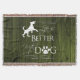 La couverture parfaite pour ceux qui trouvent la vie bien meilleure avec un chien dedans. The Life is better with a Dog Throw Blanket propose un texte qui dit "Life is better with a Dog." avec un empreinte de patte et une silhouette de chien ornée d'un arrière - plan en bois rustique vert profond. Autres cadeaux disponibles avec ce design aussi.