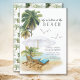 Annoncez que vous déménagez chez vos amis et votre famille avec notre vie est meilleure à la carte de plage. Notre faire-part tropicale mobile dispose de chaises longues bleues avec parasol avec palmiers et mouettes