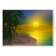 Une scène tropicale chaude d'île avec une plage, les palmiers et le coucher de soleil
