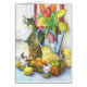 Un chat se repose à côté d'une vie immobile avec une boîte d'arrosage, des tulipes, des dispositifs trembleurs de sel de poulet et de poivre, fruit et des cuvettes.