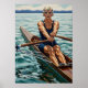 Une puissante peinture à l'huile Art Déco représentant une rameuse stylisée avec un regard direct et confiant, sa forme géométrique athlétique définie par un éclairage dramatique de chiaroscuro alors qu'elle s'assoit dans une coquille de course élégante.