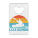 "Connu comme la Reine des lacs américains avec ses 109 milles de rivage et plus de 300 îles, le lac George est un paradis de vacances offrant des sports nautiques, de la randonnée, du vélo et des aventures en plein air sans fin. Ce design vintage a des couleurs rétro avec des arbres et un arc-en-ciel."