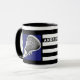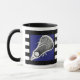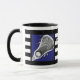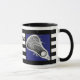 Une crosse unique, une tasse à collectionner, avec un bâton de lessive sur un arrière - plan bleu à rayures noires et blanches. Modifiez le texte pour ajouter le nom de votre joueur de crosse préféré, de votre entraîneur ou de votre fan de sports d'équipe.
