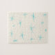 Ce motif de puzzle de l'ère spatiale turquoise présente des étoiles bleues sur un arrière - plan crémeux avec des taches dorées. Inspiré d'un classique motif de plats modernes du milieu du siècle, ce design dégage une atmosphère vintage authentique. La bonté kitschy rétro vous fera sentir comme si vous étiez tombé sur un trésor du marché aux puces. Ce motif sera également à la maison dans un appartement de New York City penthouse ou une maison atomique Palm Springs. Laissez ce motif vintage minimaliste vous inspirer !