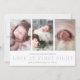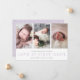 Les cartes de faire-part de naissance simples et modernes comportent trois de vos photos préférées de nouveau-nés alignées côte à côte, avec un bandeau blanc sur le bas de l'écran "l'amour au premier regard" en lilas lavande, flanqué du nom et des statistiques de naissance de votre petit. Les annonces de naissance chic pour petite fille s'inversent à un subtil motif de vignes botaniques en violet pastel assorti et blanc cassé.