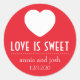 Heart Love Is Sweet Étiquette (Rouge / Blanc)...Cet amour amusant, élégant, classique, et romantique est doux merci étiquettes sont l'ajout parfait à votre remerciement faveurs pour votre mariage de destination romantique. Idéal pour les mariés et mariés qui ont leur réception de mariage dans un lieu romantique. Cet amour amusant et chic est étiquettes sucrés / autocollants sont idéales pour les faveurs de mariage ou un bar à bonbons mariages / buffet plein de chocolat, suckers, lollipops, taffy, et sucre. Faites savoir à vos invités de ramener un régal avec eux pour se souvenir de votre mariage. Le design comporte un papillon amusant. Idéal pour toute mariée et mariée qui aime faire des choses romantiques ou qui planifie une escapade romantique en lune de miel. Parfait pour toute réception de mariage à thème de la Saint-Valentin. Idéal pour une douche nuptiale ou une soirée bachelorette. Personnalisable...il suffit de changer les noms et les dates et vos autocollants de faveur sont prêts à être utilisés. Disponible dans une large gamme de couleurs pour correspondre à vos couleurs mariages. Voir WindyCityStationery.com pour notre gamme complète de étiquettes "Coeur" dans une large gamme de couleurs ainsi que les timbres-poste "Coeur" correspondants, cartes de remerciements, étiquettes d'adresse de retour, enregistrer les dates et plus encore.