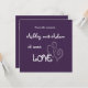 Joli, amusant Faire-part de mariage avec un Arrière - plan foncé violet, le mot Amour dans une police blanche et blanc et deux Coeurs entrelacés. Un design faire-part de mariage moderne entièrement personnalisable. Elke Clarke©. Pour les autres couleurs arrière - plans, veuillez contacter luxuryweddinginvitations@gmail.com.