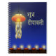 Illustration de Happy Diwali : Une lampe de Diwali brillante avec des diyas rouges (lampes à huile indienne en forme de tasse) avec une bordure ornementale sur un arrière - plan du ciel nocturne et l'accueil écrit en sanskrit.