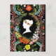 Cette carte postale enregistre un poème d'amour écrit par un garçon à une fille dans la "langue des fleurs", le moyen de communication de l'ère victorienne dans lequel diverses fleurs et arrangements floraux ont été utilisés pour envoyer des messages codés, permettant aux individus d'express des sentiments qui autrement ne pouvaient pas être parlés. En commençant par le côté gauche de la couronne sur le côté droit, chaque fleur révèle une autre partie du puzzle manquant. Sont inclus dans le poème les amaranthes globes, les lunettes noires, les marguerites, les pavots, les pavots, les tulipes, les gloires du matin, roses, magnolias, feuilles de lauriers, laurestine, oublions-moi-nots, suckle de miel. Essayez de déchiffrer le poème avec votre guide ici : http://en.wikipedia.org/wiki/Language_of_flowers La silhouette de la reine Victoria occupe une place prépondérante sur l'arrière - plan noir comme symbole de l'époque et comme amoureux de la beauté et du port des fleurs dans les cheveux.