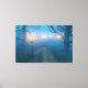 Quatre lampes brillantes sur quatre lampadaires brillent à travers un brouillard dense, illuminant un chemin sinueux à travers les ombres et des banches nues d'arbres d'hiver.