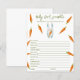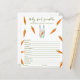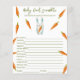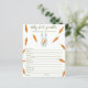 Invitations de douches pour bébés sans sexe. Avec le dicton "UN PETIT BUNNY EST EN ROUTE !", illustration d'un lapin d'aquarelle (lapin) avec carotte en pattes, et de nombreuses carottes de couleur orange. Éléments correspondants disponibles. Réponses : CRAVINGS, PLEIN, PACIFICATEUR, BOUTEILLE, LUMIÈRE NOCTURNE, LULLABY, STROLLER, ÉPIDURAL, BRÛLE, CHAISE HAUTE, SAC DE DIAPER, ÉPONSE