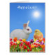 Beau lapin de Pâques blanc avec des fleurs de poussins et de tulipes sur la carte bleu ciel ensoleillé. Le texte peut être personnalisé pour Pâques ou Anniversaire. Les lapins symbolisent la longévité, l'abondance et la bonne fortune.