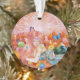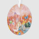 Tout est rose et tons chauds du fond aux cheveux de la jeune dame, ciel rose, tulipes roses, peluches, etc.
